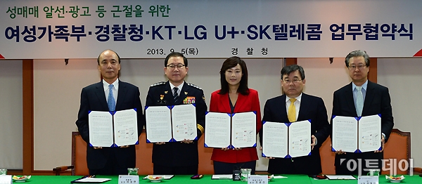 성매매 알선·광고 등 근절을 위한 여성가족부·경찰청·통신3사 간 업무협약식이 5일 오전 서대문구 경찰청에서 열렸다. 고현진 LG 유플러스 부사장(왼쪽부터), 이성한 경찰청장, 조윤선 여성가족부 장관, 김홍진 KT사장, 이명근 SK텔레콤 기업사업부문장이 협약서에 사인 후 기념촬영을 하고 있다. 노진환 기자 myfixer@