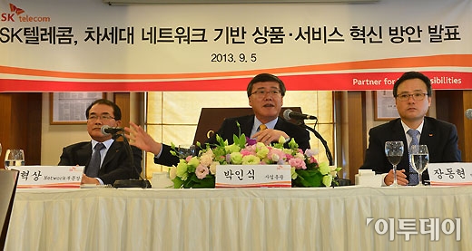 SK텔레콤이 5일 서울 태평로 프레스센터에서 차세대 네트워크 기반 상품·서비스 혁신방안을 발표했다. 권혁상 네트워크 부문장, 박인식 사업총괄, 장동현 마케팅부문장이 취재진의 질문에 답하고 있다. 양지웅 기자 yangdoo@