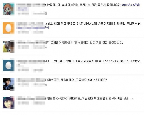 SNS에는 이날 새벽 3시부터 서울, 경기, 인천 등 수도권과 안동, 창원에서도 휴대전화 ‘서비스 안됨’표시가 나타난다는 글이 올라왔으며, 한 트위터리안은 "SKT, 왜이래~20분째 통화불능, 나 좀 살려줘"라는 글을 올리기도 했다.