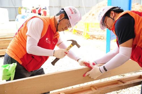 ▲SK건설 최광철 사장(시진 왼쪽)이 지난달 30일 ‘수원SK행복마을’ 건축현장에서 ‘희망의 집짓기’ 봉사활동에 참가하고 있다. (사진=SK건설 제공)