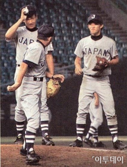 사진 속 오른쪽 야구선수 다리 사이에는 어린아이가 팔만 내밀고 서 있다.