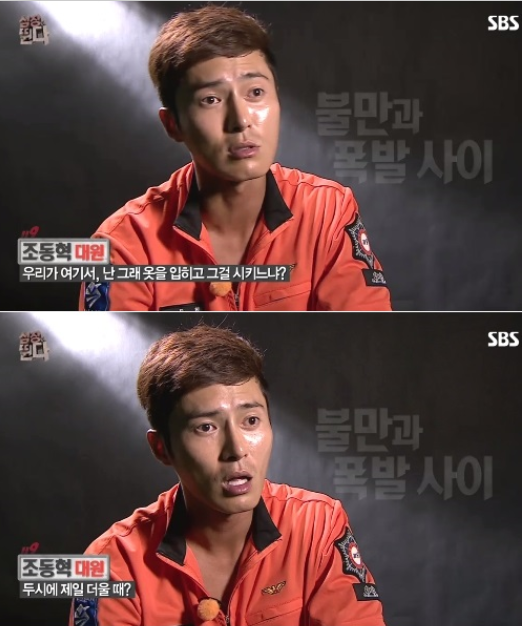 이날 방송에서 조동혁은 방화복 훈련을 받는 내내 불만에 찬 표정이었다. 훈련관의 지시에 따라 정해진 시간안에 훈련복을 가져다 두고 가져오고, 입고 벗고 하는 훈련이었지만 하루 중 가장 더운 낮 2시에 방한복을 입자 옷 안의 온도는 40도를 웃돌았기 때문이다. 이에 훈련관은 “하기 싫습니까?”라고 물었다.