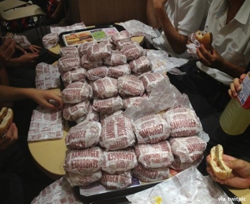 공개된 사진 속에는 햄버거가 테이블 위에 산처럼 쌓여있다. 그 주위는 교복을 입은 청소년들이 둘러앉아 있다.