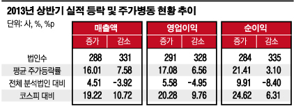 9일 한국거래소가 2013사업연도 반기보고서를 제출한 유가증권시장 12월 결산법인 총 695개 기업 중 619개 기업의 상반기 실적과 주가와의 연관성을 분석한 결과, 반기순이익이 전기 대비 증가한 284개 기업의 경우 올 초부터 4일까지 평균 21.41% 주가상승을 기록했다.