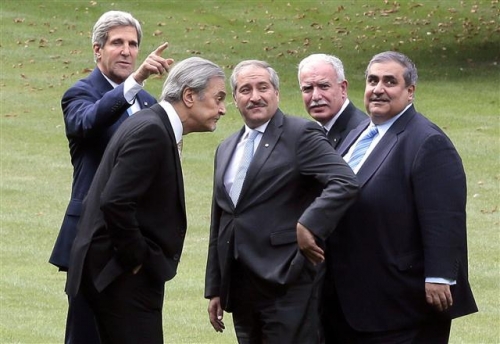 존 케리 미국 국무장관(맨 왼쪽부터)이 8일(현지시간) 파리주재 미 대사관에서 사우드 알파이살 사우디아라비아 외무장관을 비롯해 나세르 주데(요르단) 리야드 알 말키(팔레스타인) 호샤르 제바리(이라크) 등 아랍연맹(AL)의 장관급 인사를 만나 대시리아 군사개입에 대한 지지를 호소했다. 앞서 케리 장관은 7일 리투아니아에서 유럽연합(EU) 외무장관들을 만나 지지를 호소했다. 미 상원은 오는 11일 전체회의를 열고 시리아 군사개입 결의안을 처리할 것으로 예상되고 있다. 파리/AFP연합뉴스
