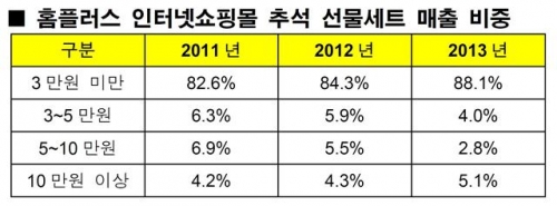 홈플러스가 자사 인터넷쇼핑몰의 8월19일~9월7일까지 20일 간 매출을 분석한 결과에 따르면, 3만원 미만 초저가 선물세트 매출이 전년 동기 대비 311% 증가하면서 전체 매출 중 88.1%를 차지했다.