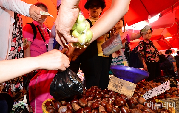 민족 최대의 명절 추석이 열흘 앞으로 다가온 9일 오후 서울 제기동 경동시장을 찾은 시민들이 밤 등 제수용품을 구입하고 있다. 노진환 기자 myfixer@