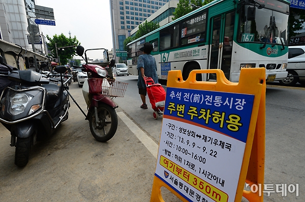 안전행정부가 추석을 맞아 전통시장을 찾는 시민들의 편의를 위해 경찰청과 공동으로 9일부터 22일까지 전국 436개 전통시장에 대해 한시적으로 최대 2시간까지 주ㆍ정차를 허용한다. 9일 오후 서울 제기동 경동시장에 추석 전 전통시장 주변 주차를 허용하는 안내판이 설치돼 있다. 노진환 기자 myfixer@