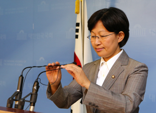 김미희 통합진보당 의원이 9일 오후 국회 정론관에서 기자회견을 하기 전 마이크를 조절하고 있다. 김 의원은 이날 기자회견에서 일부 언론이 자신을 또 다른 RO 총책이라고 보도한 내용에 대해 법적 대응을 할 것이라고 밝혔다.