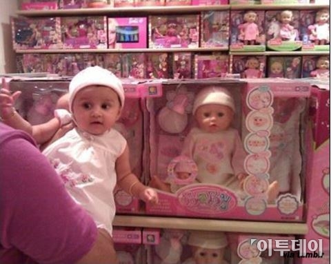 사진 속 마트에 진열된 인형을 본 엄마는 아기를 인형 옆으로 옮겨본다. 인형과 아기는 모자부터 얼굴까지 꼭 닮았다.