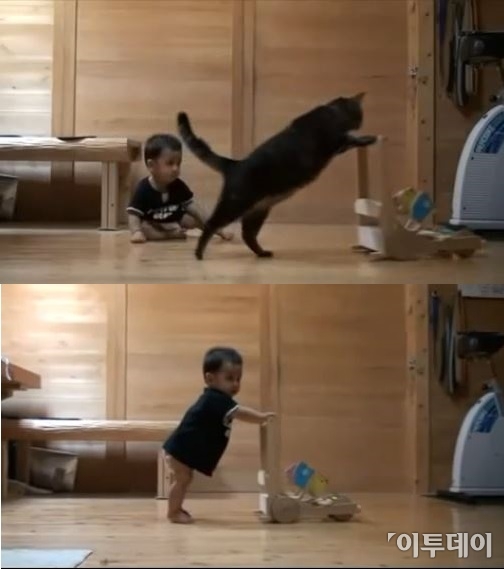 영상 속 고양이는 걸음마 장난감을 끌고 아기 앞을 지나간다. 고양이를 지켜본 아기는 고양이처럼 걸음마 장난감을 끌고 걸어간다.