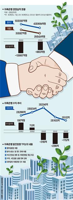 지난 2012회계연도(2012년7월~2013년6월)의 8803억원 적자는 저축은행 업계가 처한 상황을 여실히 보여준다. 91개 저축은행 중 적자 저축은행 수는 50개사로 직전 회계연도(49개사) 대비 1개사가 증가하는 등 절반을 훌쩍 뛰어넘는 저축은행들이 적자를 면치 못했다.