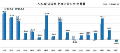 지역별로는 △서울(0.34%) △대구(0.30%) △경기(0.28%) △경북(0.27%) △인천(0.23%) △세종(0.23%) △경남(0.12%) △대전(0.10%) △강원(0.09%) 등의 순으로 상승했다.