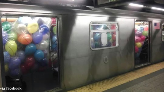 이 사진은 뉴욕에서 포착된 것으로 지하철 안에는 사람이 들어갈 수 없을 정도로 풍선이 빽빽하게 들어차 있다.