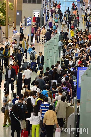 추석연휴를 앞두고 13일 오전 인천국제공항 출국장이 해외로 나가는 사람들로 붐비고 있다. 이번 추석연휴는 휴일과 주말을 더해 최장 9일까지 쉴 수 있는 황금연휴다. 방인권 기자 bink7119@