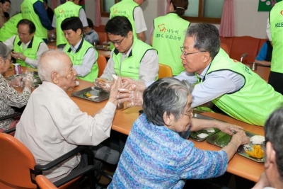 ▲9일부터 전행적으로 진행되고 있는 KEB 2013 추석 사랑나눔 활동의 일환으로 12일 서울 동대문구 소재 노인복지 시설인 은천노인복지회를 방문한 윤용로 외환은행장(사진 오른쪽)이 은천노인복지회 소속 소외계층 어르신께 정성껏 빚은 송편을 입에 넣어드리고 있다.
