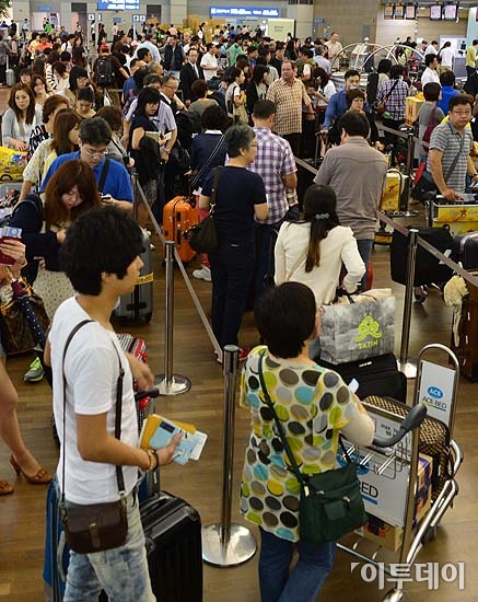 추석연휴를 앞둔 13일 오전 인천국제공항 출국장이 해외로 나가는 사람들로 붐비고 있다. 이번 추석연휴는 휴일과 주말을 더해 최장 9일까지 쉴 수 있는 황금연휴다. 방인권 기자 bink7119@