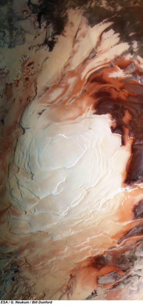 최근 유럽우주국의 위성 '마스 익스프레스'가 촬영한 청색, 적색, 적외선 이미지를 합성해 만든 '화성 남극 사진'이 해외 온라인 커뮤니티에 올라와 네티즌의 눈길을 사로잡고 있다.