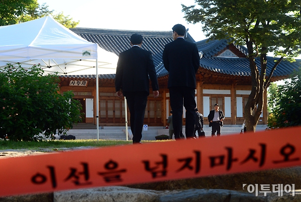 박근혜 대통령과 여야 대표의 ‘16일 국회 3자회담’이 16일 오후 여의도 국회 사랑재에서 열릴 예정이다. 이날 오전 회담을 앞둔 사랑재에서 경호실 관계자들이 주변을 살펴보고 있다. 노진환 기자 myfixer@