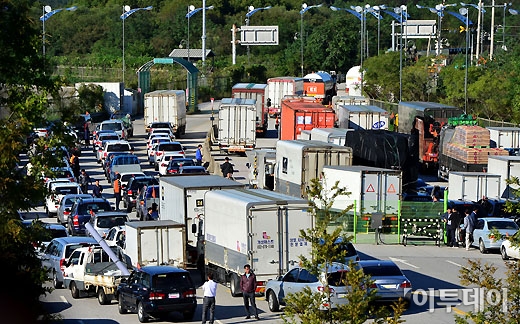 지난 4월 3일 북한의 일방적 조치로 가동이 중단된 개성공단이 160여일 만에 재가동을 맞았다. 공단 관계 차량들이 16일 경기 파주시 도로남북출입사무소를 통해 개성으로 향하고 있다. 양지웅 기자 yangdoo@