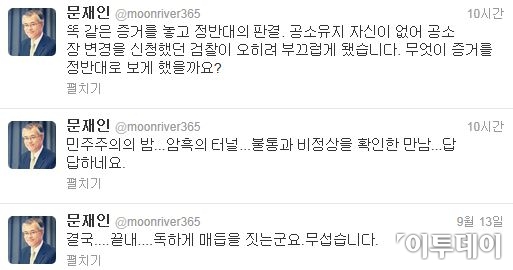 문재인 의원은 채동욱 검찰총장이 사의를 밝힌 지난 13일에는 “결국…끝내…독하게 매듭을 짓는군요. 무섭습니다”라고 트윗했다.
