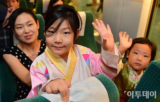 2013년 추석연휴를 하루 앞둔 17일 오전 서울역에서 한복을 곱게 차려입고 귀성길에 나선 한 가족이 손을 흔들고 있다. 방인권 기자 bink7119@