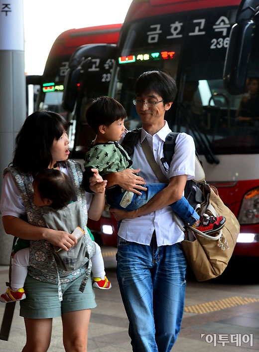 민족 최대의 명절인 추석을 이틀 앞둔 17일 서울 강남고속터미널에서 한 가족이 귀성길에 오르고 있다. 양지웅 기자 yangdoo@