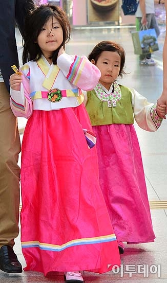 2013년 추석연휴를 하루 앞둔 17일 오전 서울역에서 한복을 곱게 차려입고 귀성길에 나선 어린이들이 열차를 타기 위해 걸음을 재촉하고 있다. 방인권 기자 bink7119@