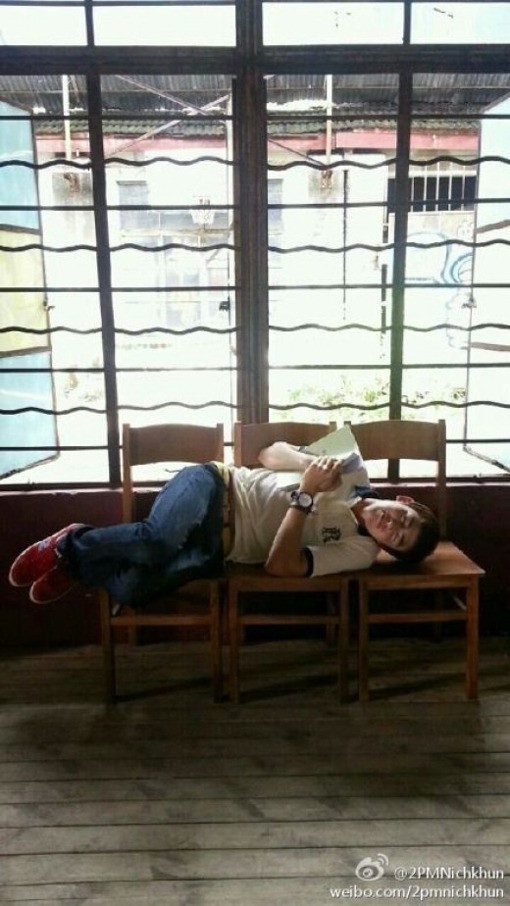 공개된 ‘닉쿤 쪽잠’ 사진 속 닉쿤은 불편해 보이는 나무 의자에 누워 피곤한 듯 잠에 빠진 모습을 하고 있다.