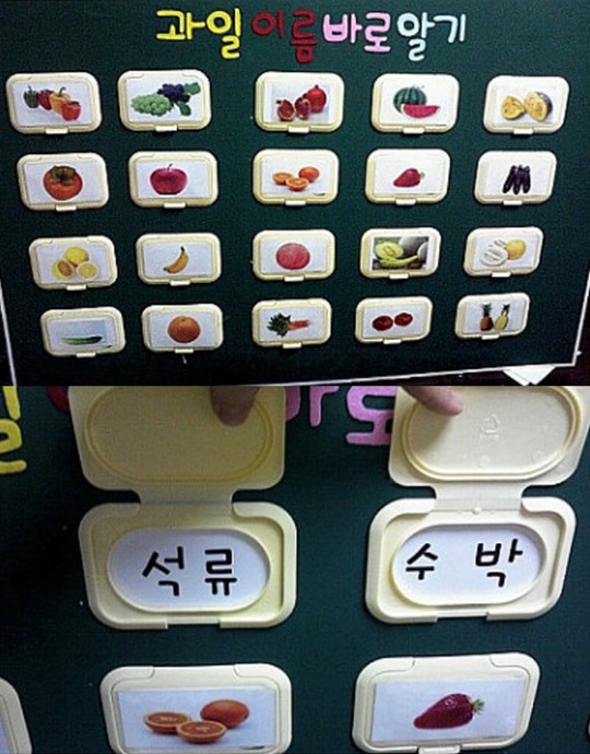사진 속 ‘과일이름 바로알기’ 교구는 물티슈 커버를 이용해 덮개를 만들었다.