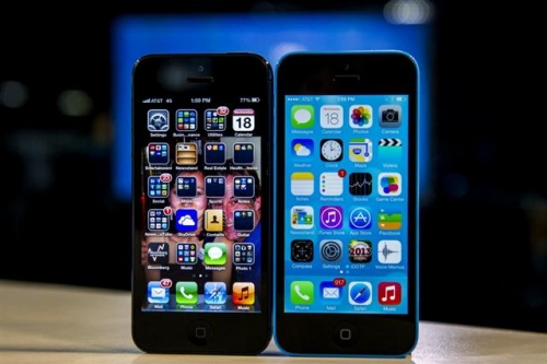 ▲지난 18일(현지시간) 미국 캘리포니아주 샌프란시스코에서 기존의 운영체제인 iOS6 기반의 아이폰5(왼쪽)와 iOS7이 탑재된 보급형 모델 아이폰5C가 나란히 진열된 모습.블룸버그