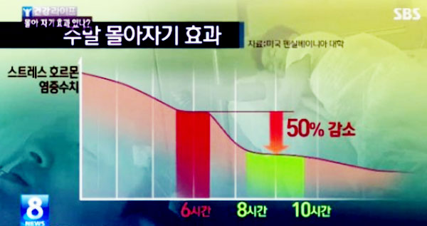 최근 미국 펜실베이니아 대학 연구 결과에 따르면, 주말에 8시간에서 10시간 정도 잠을 몰아 잘 경우 평소에 6시간만 잤을 때보다 혈중 스트레스 호르몬과 염증 수치가 절반 이하로 감소하고 고혈압 위험도도 39% 낮아지는 것으로 나타났다.