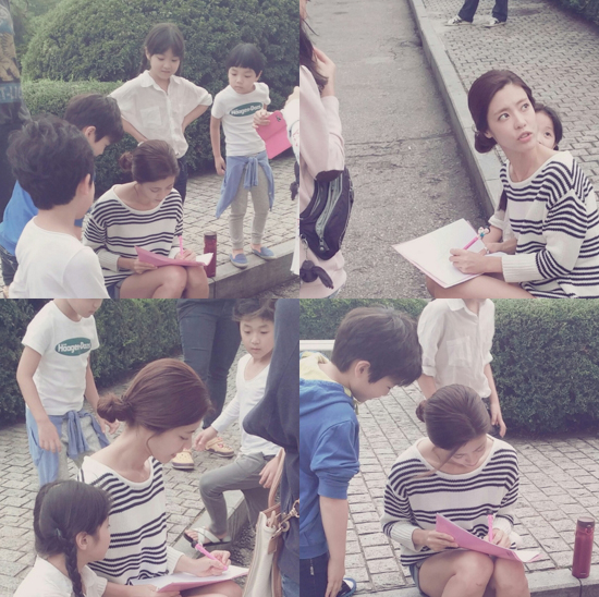 이윤지의 소속사 나무엑터스는 22일 공식 트위터를 통해 KBS 2TV 드라마 ‘왕가네 식구들’ 촬영 현장 사진을 공개했다. 사진 속 이윤지는 어린이들에게 둘러싸인 채 종이와 펜을 들고 한껏 집중하고 있는 모습이다.