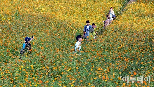 밤과 낮의 길이가 같아진다는 추분(秋分)을 하루 앞둔 22일 서울 송파구 방이동 올림픽공원내 황화코스모스 밭을 찾은 시민들이 만개한 꽃을 보며 가을의 정취를 만끽하고 있다. 방인권 기자 bink7119@