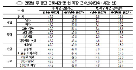 청년층 근로자의 주 평균 근로시간은 47.9시간으로 중장년층 근로자의 평균 49.6보다 짧았다. 중장년층 여성 근로자는 근로시간에서도 남성보다 열악한 환경에 처한 것으로 조사됐다.