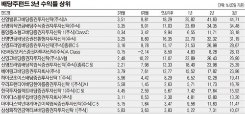 개별 펀드 별로는 배당주펀드의 대표주자 ‘신영밸류고배당’이 3년 수익률 44.71%로 1위를 달리고 있는 가운데 ‘동양중소형고배당’(33.18%), ‘KB배당포커스’(28.13%), ‘베어링고배당’(23.96%) 등이 양호한 수익을 보이고 있다.