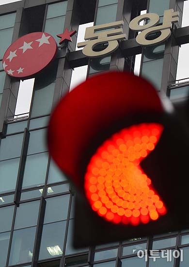 기업어음(CP) 상환을 앞둔 재계 38위 동양그룹의 자금난이 갈수록 커지고 있다. 기대했던 ‘자매기업’ 오리온그룹이 도울 의사가 없음을 밝힌 데다 채권단마저 신규 지원에 난색을 표하고 있어 ‘사면초가’ 신세로 전락했다. 24일 오전 서울 중구 을지로 2가 동양그룹 본사 앞의 신호등에 빨간불이 켜져 있다. 방인권 기자 bink7119@
