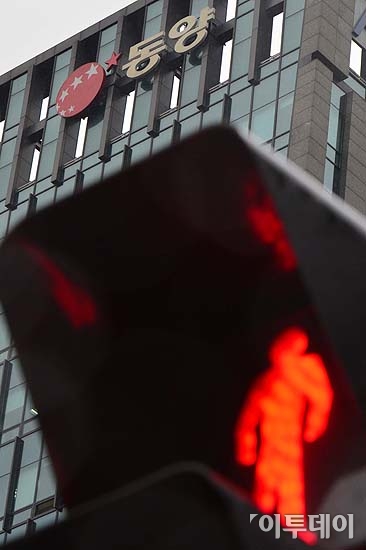 기업어음(CP) 상환을 앞둔 재계 38위 동양그룹의 자금난이 갈수록 커지고 있다. 기대했던 ‘자매기업’ 오리온그룹이 도울 의사가 없음을 밝힌 데다 채권단마저 신규 지원에 난색을 표하고 있어 ‘사면초가’ 신세로 전락했다. 24일 오전 서울 중구 을지로 2가 동양그룹 본사 앞의 신호등에 빨간불이 켜져 있다. 방인권 기자 bink7119@