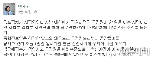 안소희 의원은 지난 19일 자신의 페이스북에 “공포정치가 시작되었다. 지난 대선에서 집권세력과 국정원이 한 일을 아는 사람이라면 사법부 입법부 시민단체 학생 공무원 할 것 없이 간첩 빨갱이 RO 라는 소리를 듣는다. 통합진보당은 심각한 날조와 왜곡으로 국정원으로부터 공안몰이를 당하고 있다. 오늘 1만인 동시다발 출근 일인시위에 우리가 나선 이유다. 박근혜정부가 책임지고 국정원을 해체수준으로 개혁해야만이 이 싸움이 끝이 난다. 국민이 지켜보고 있다. 파주도 총 5곳에서 일인시위를 진행했다”는 글을 올렸다.
