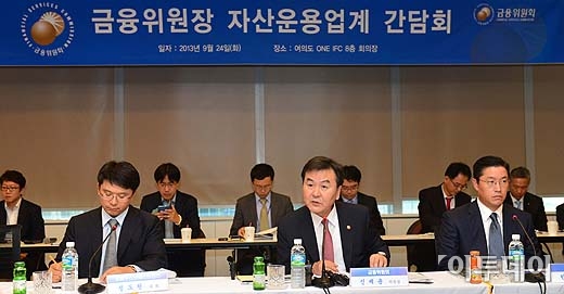신제윤 금융위원장이 24일 오후 서울 영등포구 국제금융센터 회의장에서 열린 ‘자산운용업계 간담회’에 참석해 인사말을 하고 있다. 방인권 기자 bink7119@