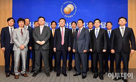 신제윤 금융위원장이 24일 오후 서울 영등포구 국제금융센터 회의장에서 열린 ‘자산운용업계 간담회’에서 자산운용사 대표들과 기념촬영을 하고 있다. 방인권 기자 bink7119@