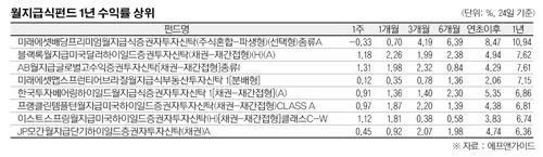 현재 1년 수익률이 가장 높은 펀드는 ‘미래에셋배당프리미엄월지급식’으로 10%가 넘는 성적을 기록하고 있다. ‘블랙록월지급미국달러하이일드’(7.62%), ‘AB월지급글로벌고수익’(7.61%), ‘미래에셋맵스프런티어브라질월지급식부동산’(7.15%), ‘한국투자베어링하이일드월지급식’(6.86%), ‘프랭클린템플턴월지급미국하이일드’(6.81%) 등도 양호한 수익을 거두고 있다.