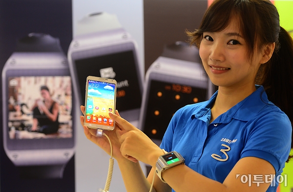 삼성전자가 25일 오전 서초동 삼성전자 사옥에서 프리미엄 스마트폰 갤럭시 노트 3와 웨어러블 스마트 기기 갤럭시 기어의 국내 출시를 맞아 미디어데이를 개최했다. 이날 오전 모델이 제품을 소개하고 있다. 노진환 기자 myfixer@