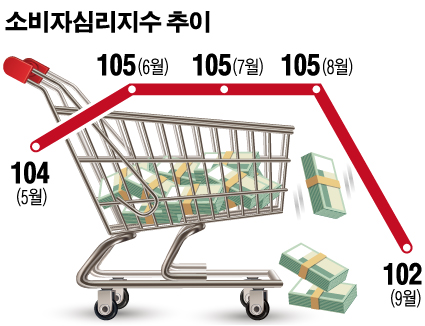 한국은행이 26일 발표한 '9월 소비자 동향조사 결과'에 따르면 이달 소비자심리지수는 102로 전월보다 3포인트 하락했다.