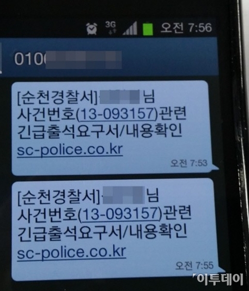 순천경찰서가 페이스북 등을 통해 공개한 문자메시지는 받는 사람의 실명이 적힌 “ㅇㅇㅇ님 사건번호(13-093157) 관련 긴급출석요구서/내용확인”이라는 내용과 함께 sc-police.co.kr이라는 주소의 인터넷페이지가 링크돼 있다.