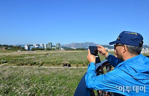 완연한 가을 날씨를 보인 26일 오후 서울 마포구 하늘공원을 찾은 한 시민이 파란하늘과 갈대숲을 휴대폰으로 촬영하고 있다. 방인권 기자 bink7119@