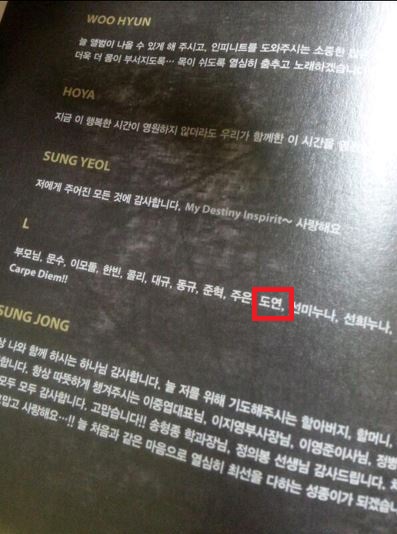 27일 온라인 게시판을 중심으로 최근 인피니트가 발표한 싱글 '데스티니(Destiny)' 앨범의 '땡스투' 페이지가 돌고 있다. 엘이 나열한 감사한 사람들 이름 속에 '도연' 이라는 이름이 있어서다.