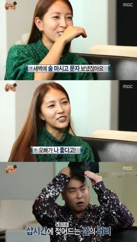 보아는 "그 문자를 내가 못 잊고 있는다 아주"라며 "새벽에 술 마시고 문자 보내지 않았나. 오빠가 나 좋다고"라고 폭로를 이어갔다. 이에 길은 삽시간에 머리에서 땀을 흘리며 당황했다. 땀을 닦는 길의 모습을 본 보아는 "아, 대머리도 땀이 나는구나"라고 돌직구를 날렸다.