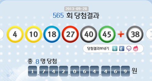 로또 565회 당첨번호가 '4,10,18,27,40,45'로 결정된 가운데, 1등 당첨자는 8명으로 나타났다.