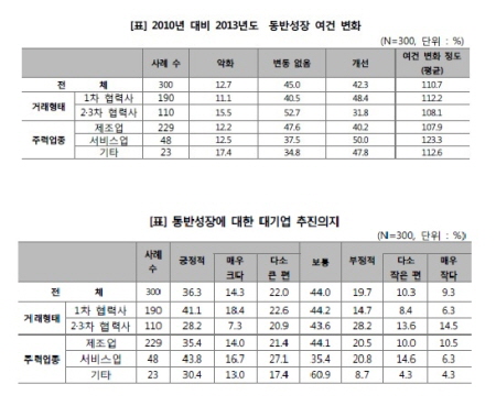 동반성장에 대한 대기업 추진의지를 바라보는 시각도 달랐다. 1차 협력사는 41.1%가 긍정적이고 14.7%가 부정적으로 답한 반면 2·3차 협력사는 긍정과 부정의 응답률이 28.2%로 같았다.